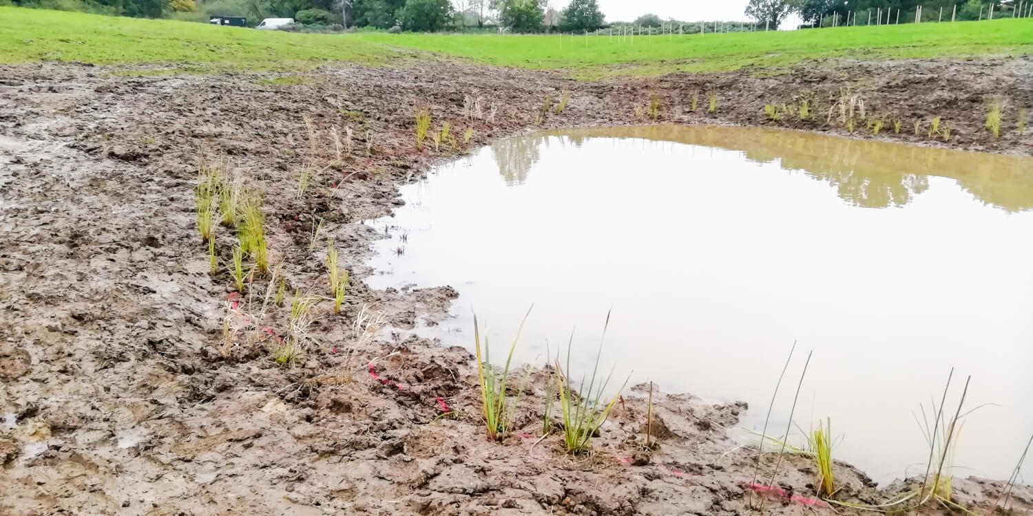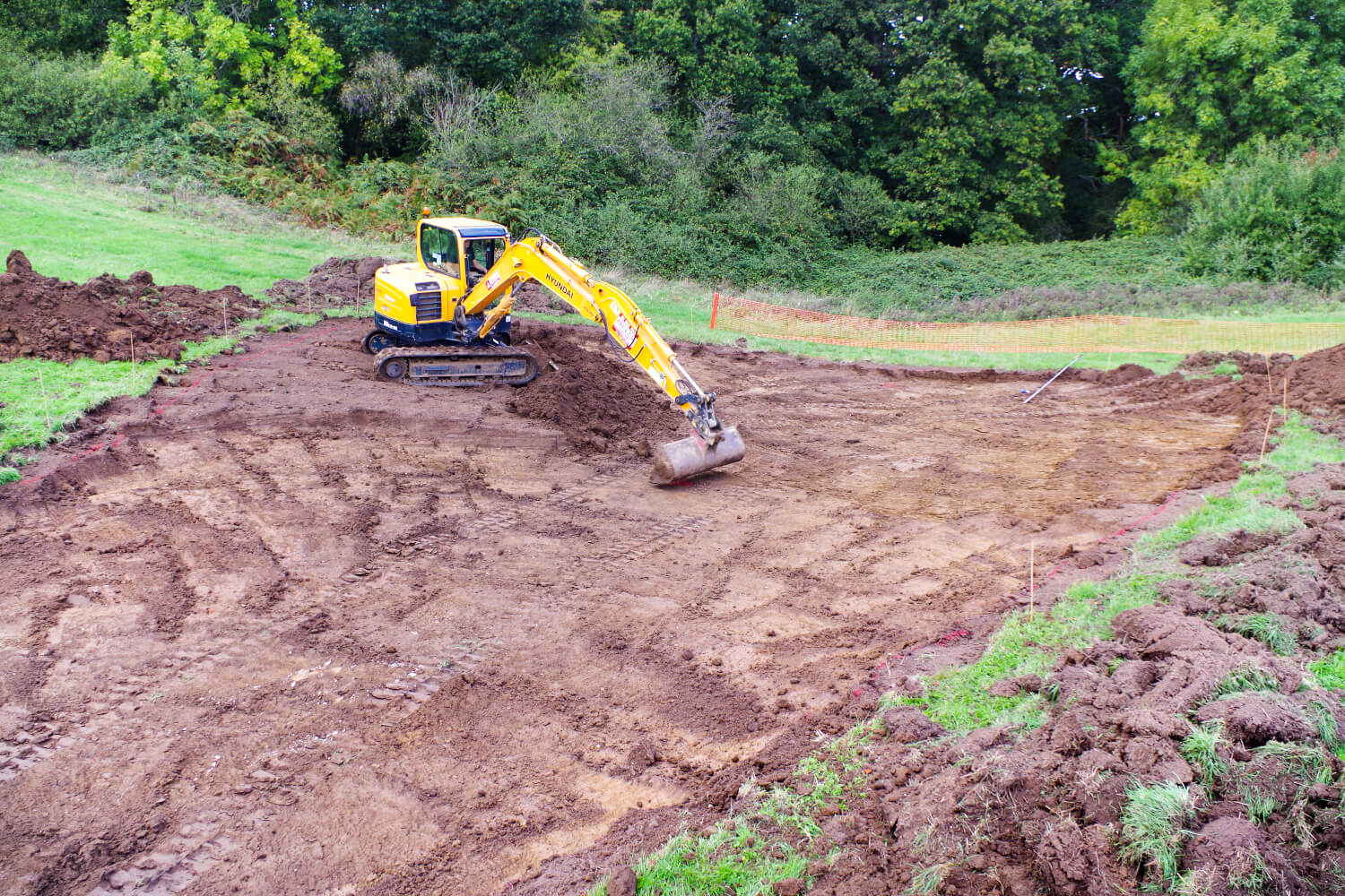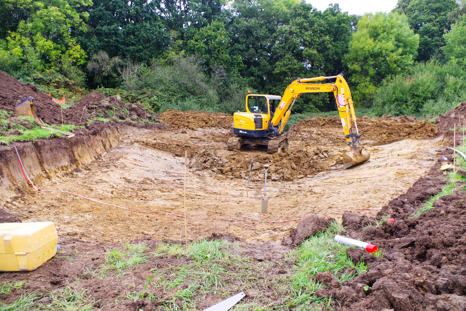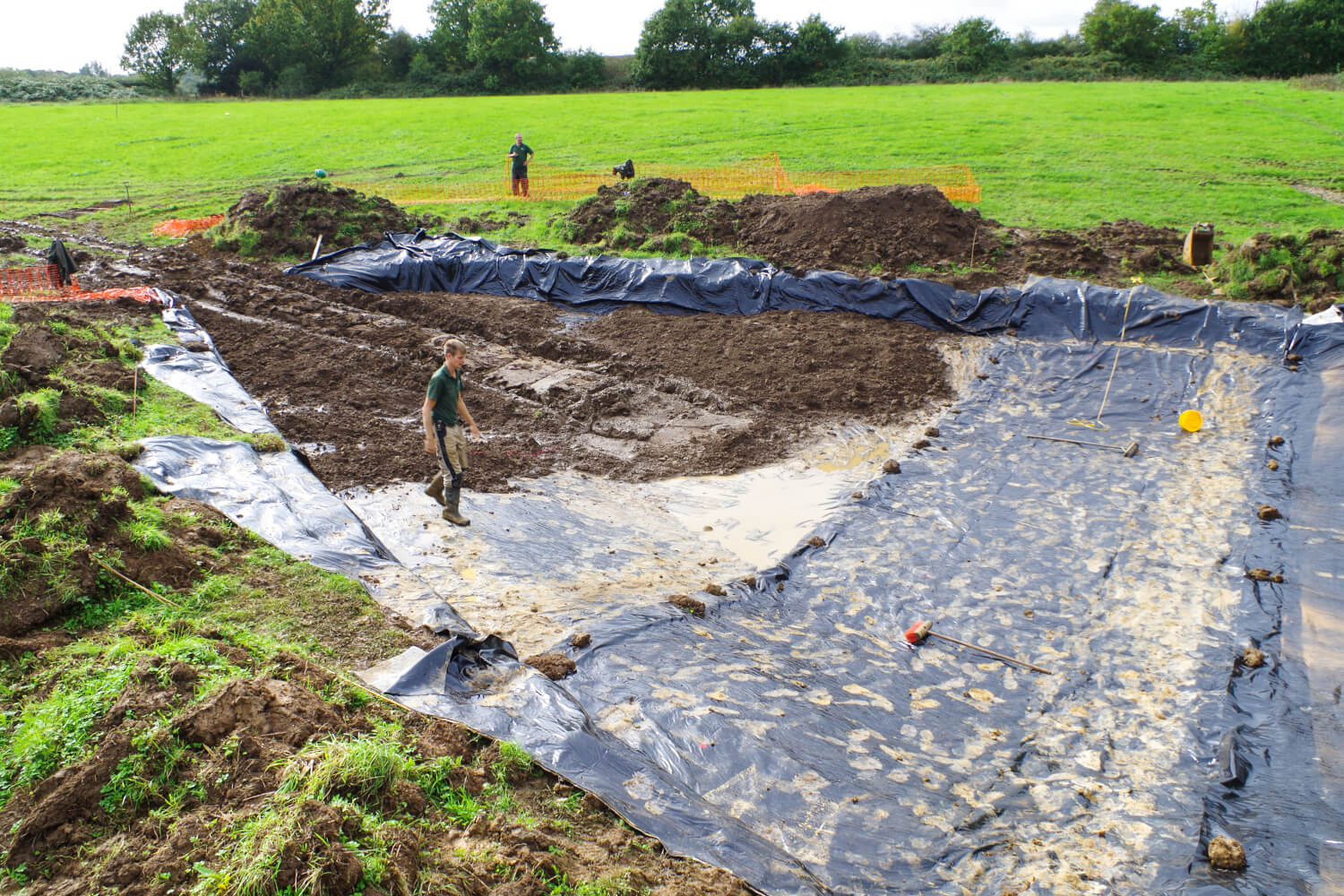The field featured a natural valley which characteristically collected water from the clayey surroundings and funnelled it towards the nearby woodland. This led to a design where, by utilising excavations from the pond itself to create a clay bund at the bottom of the valley, no extra water input was necessary. As the client was keen on year-round water retention, the pond was also designed with a liner.